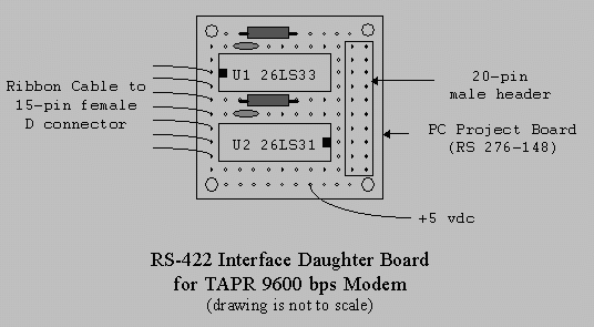 Interfacing the PI2 card with an external modem via the TTL signal levels is the easiest option, though not the most optimal. The short distance of TTL limits the choices of where to place the modem in a typical installation and TTL is prone to interference. The solution is to install the optional RS-422 interface onto the Ottawa PI2 card. This will extend the distance an external modem can be placed and provide for a high speed interface that is more resistant to interference than TTL. However, the TAPR 9600 bps modem does not have a RS-422 interface option. It was designed for TTL levels from the modem disconnect header of the host TNC. Therefore, a daughter board needs to be constructed for the TAPR modem to interface the TTL signals with RS-422 signals coming from the Ottawa PI2 card.