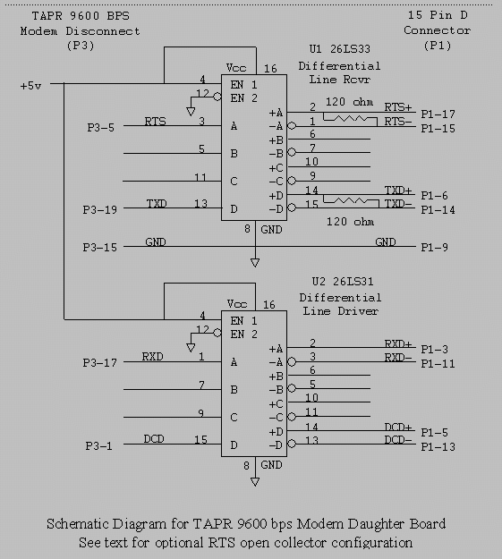 Interface Cable Wiring Diagram PI2 card Description TAPR modem -------- ----------- ---------- P1-6 TXD(+) P1-6 P1-14 TXD(-) P1-14 P1-7 RTS(+) P1-7 (*) P1-15 RTS(-) P1-15 (*) P1-3 RXD(+) P1-3 P1-11 RXD(-) P1-11 P1-5 DCD(+) P1-5 P1-13 DCD(-) P1-13 P1-9 Ground P1-9 (*) Note: See text for optional open collector configuration.
